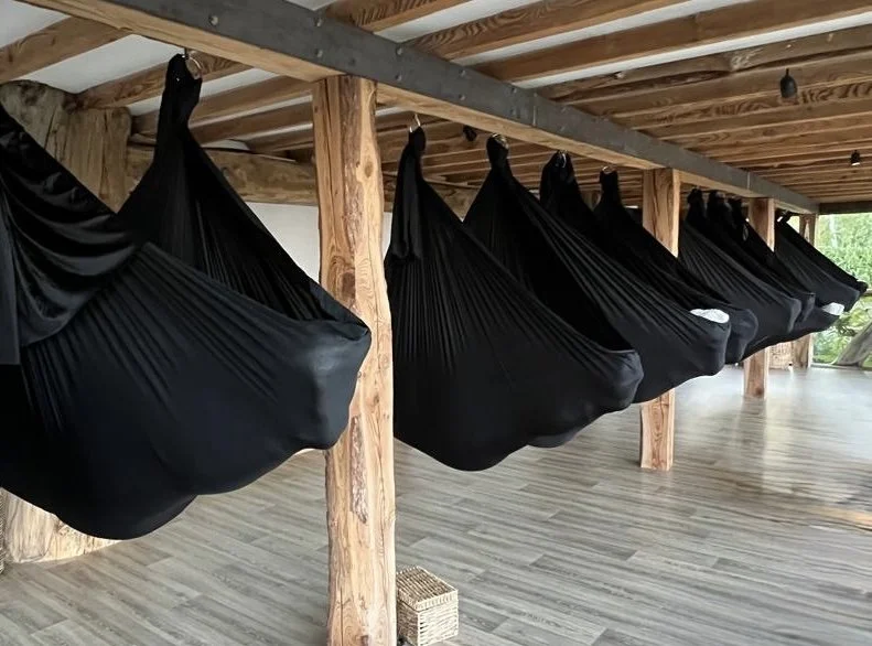 In this special experience, the yoga silks become a soft cocoon, cradling your body so the muscles can fully release and the nervous system can down-shift into deep rest. There are no poses to perform and no strength required, you simply lie comfortably inside the hammock while being guided through Yoga Nidra.